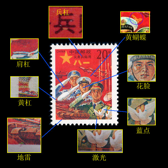 “义务兵贴用”邮票有“花脸”、“黄杠”、“肩杠”、“兵杠”、“蓝点”、“激光”、“地雷”、“黄蝴蝶”、“补丁”、“丝带”和“灵芝”等多种变体,这些众多的“变体”(或者叫印刷缺陷)也从一个侧面反映了此套邮票的印刷质量确实令人不敢恭维,这在20世纪90年代以后所发行的邮票里面是非常罕见的。然而邮票“变体”爱好者就是邮票“缺陷”爱好者,这套邮票正是因为其众多的印刷缺陷而得到了广大变体集邮爱好者的喜爱和追捧,但这也使得这些“变体”很多时候成为了炒作的噱头。下面为“义务兵贴用”邮票部分变体的示意图: