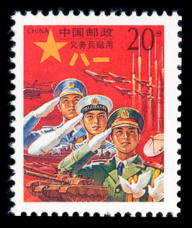 1995年8月1日为了改革和完善义务兵通信制度,解放军总参部与邮电部经国务院、中央军委批准发行了义务兵专用邮票(简称:“红军邮”)一套一枚,供沈阳军区驻辽宁、吉林、黑龙江三省的陆、海、空三军及武警部队试用,原使用的“义务兵免费信件”三角形戳记在试用地区即告停用。这套军邮是人民解放军自己的画家杨谷昌设计的。邮票围绕“神圣的使命”构思,构图以“八一”下陆海空三军仪仗兵战士行军礼形象为中心,突出义务兵的神圣使命,保卫社会主义祖国的光荣职责。因为主色为红色,人们习惯称它为“红军邮”。红军邮上,仪仗兵战士分别代表陆海空三军严整的军容和无敌的军威形象,模特写实的画法使三个年青人英俊雄健,朝气阳刚,代表了当代中国人的勃勃生机,背景以三军代表性的现代化兵器主坦克、导弹、驱逐舰、阡八战斗机、导弹直升机以及雷达、火箭等组成的诸兵种协同演习,展示了我国国防现代化及军事防卫的威慑力和综合国力的强大。和平鸽既有通信特点,又代表着和平的中国永远不会恃强凌弱,永远也不能被人欺负。加上右上角的20分字样,使整个画面既有强烈的统一,又显气势壮观。