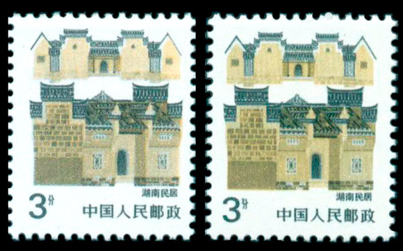 普23民居中的3分“湖南民居”票有一种“大头分”组外品,所谓“大头分”就是“分”字头上多一点。(下图中左边的票为正常票,右边为“大头分”)