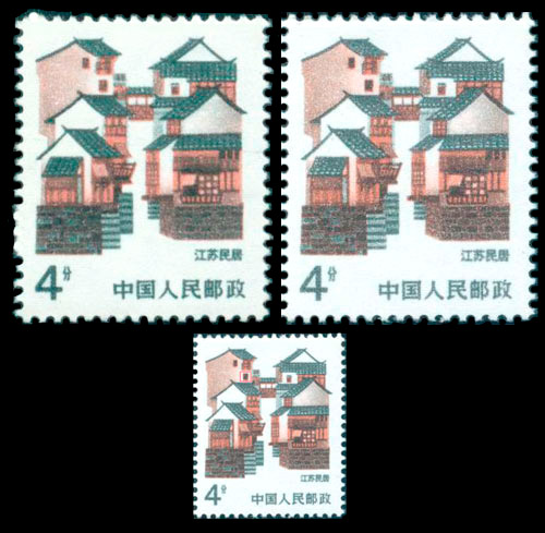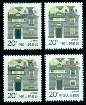 普23民居中的4分“江苏民居”,早期票楼顶的小窗呈红色,后期票(改版)楼顶的小窗呈黑色,就是所谓的“红窗黑窗”。(下图中左边的票为“红窗”,右边为“黑窗”)