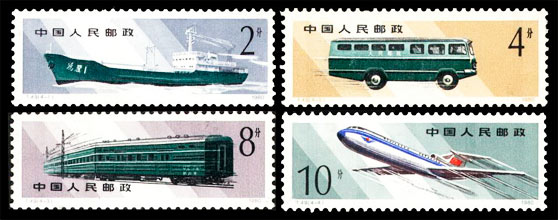 这是我国发行的第一套磷光邮票。此套票的厂铭票位列JT“厂铭十珍”,其中(4-1)“水路邮运”的厂铭最缺。 |